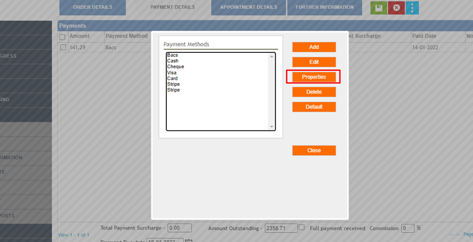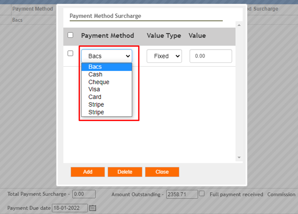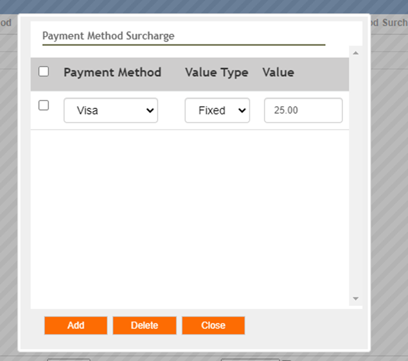 This will take you into the Payment surcharge box where you can click on the Add button to add the surcharge for the desired payment.