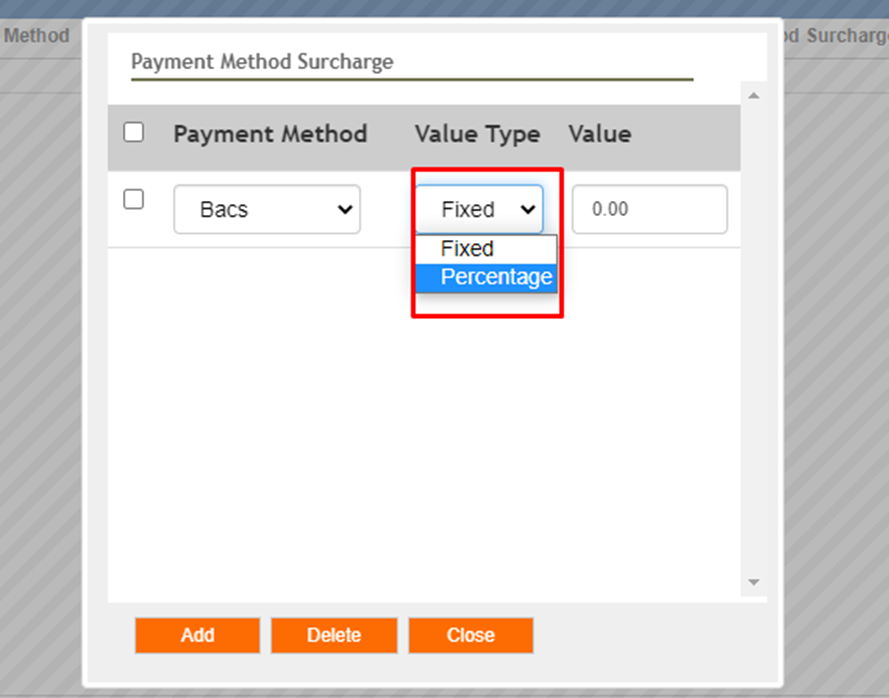 Choose the Payment method and whether the surcharge is a Fixed amount or a percentage of the payment value from the drop downs.