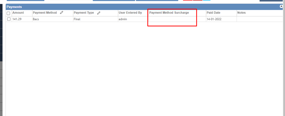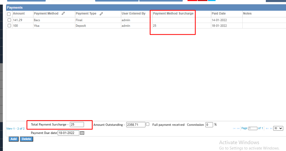When the payment is added for the Visa payment method the surcharge of £25 has been added to the payment surcharge column.